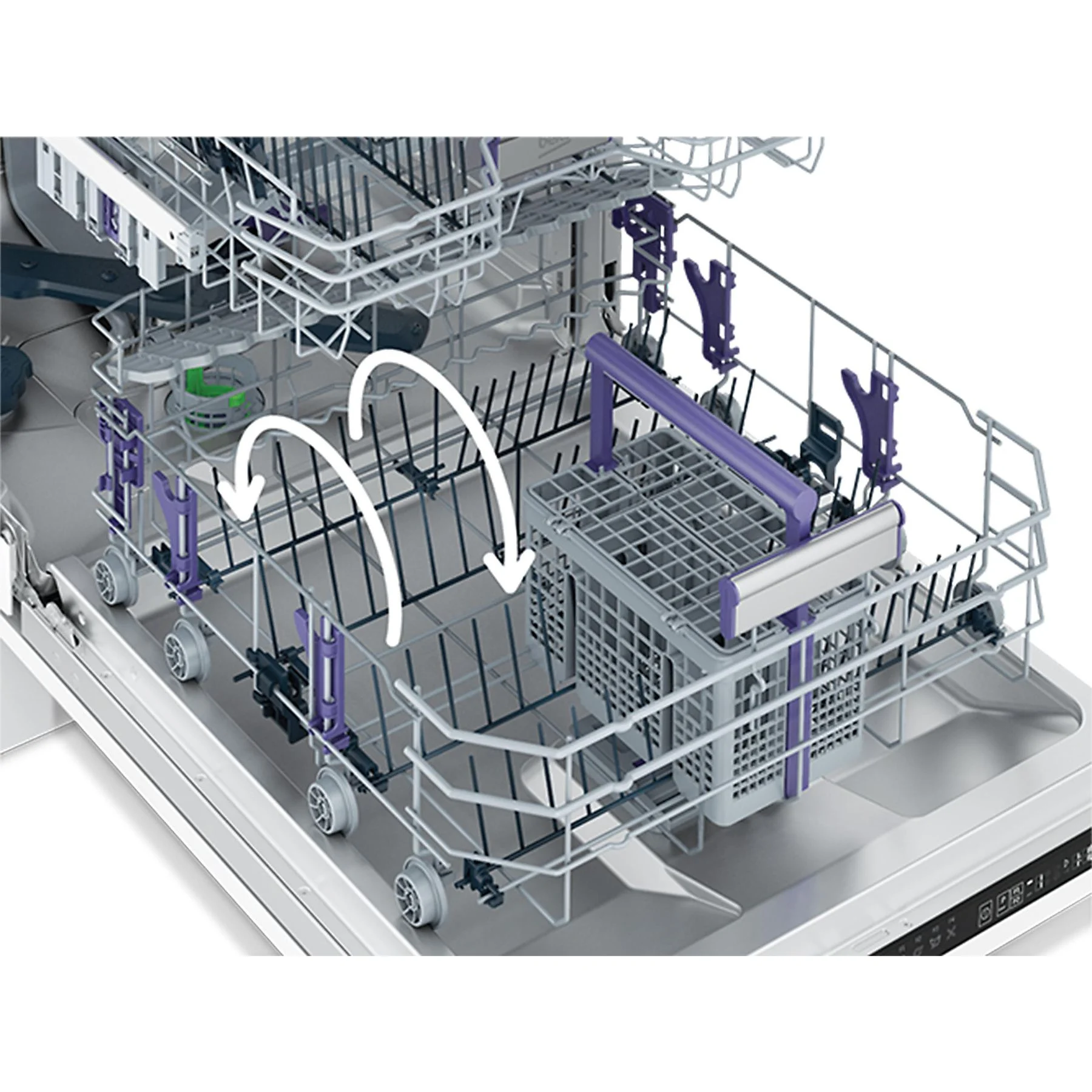 Conception de panier variablePanier supérieur réglable en hauteur, étagères à tasses pliables et réglables en hauteur dans le panier supérieur, supports à assiettes pliables dans le panier inférieur